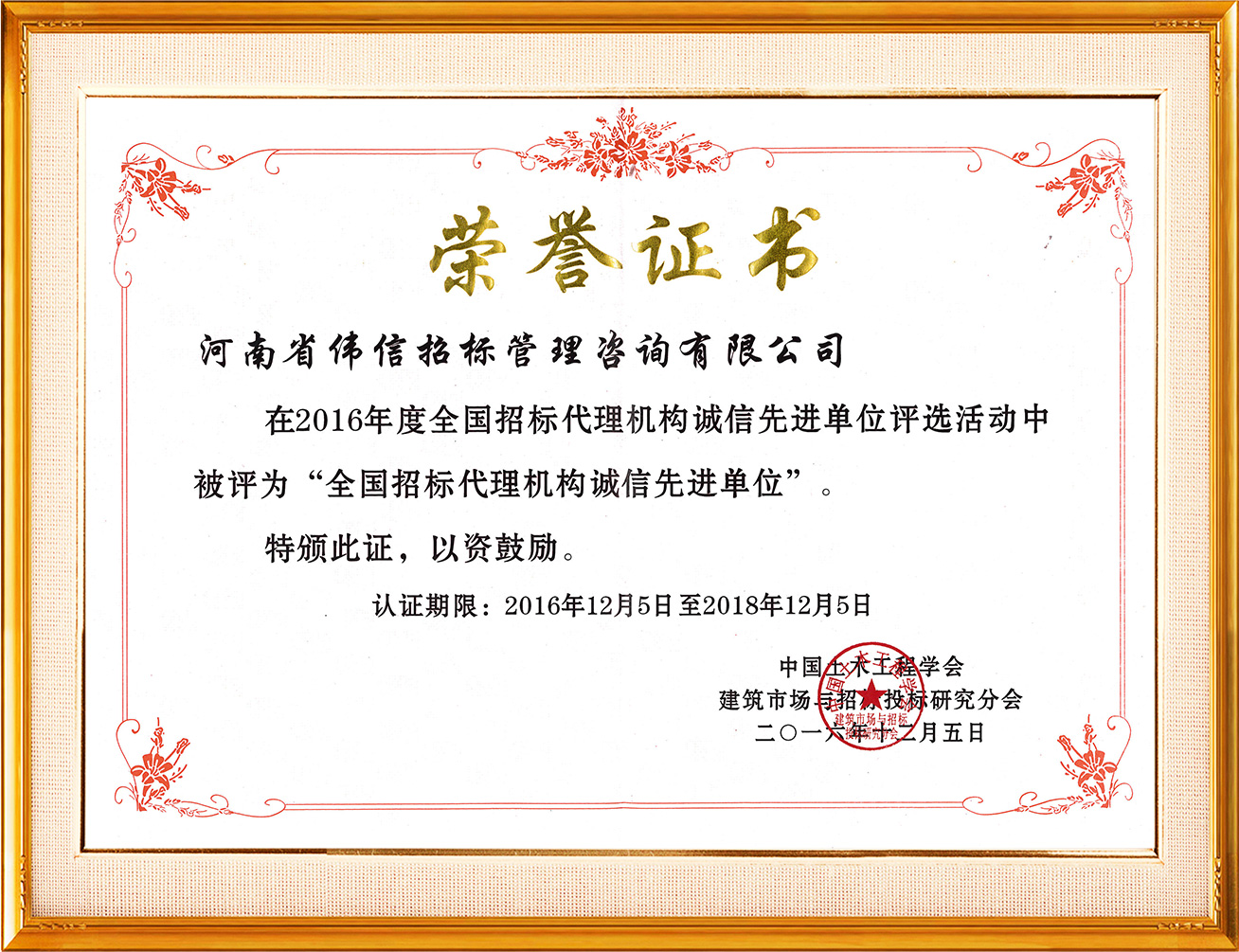 2016年全國招標代理誠信先進單位