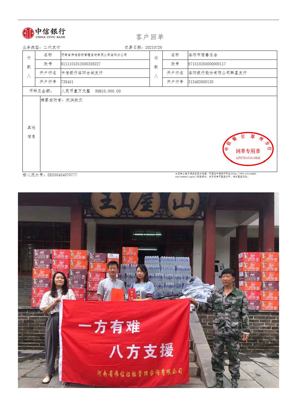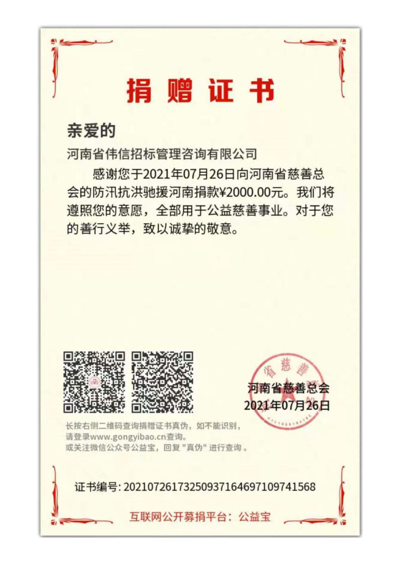 7月20日河南暴雨牽動舉國人心,河南持續暴雨致多條河流水位持續上漲并出現險情,多條道路被淹沒,多個涵洞、隧道被吞沒在洪水之中,多處城市基礎設施被毀,造成財產損失嚴重。河南偉信招標管理咨詢有限公司及員工積極捐款,共捐出約4.7萬元物資送往災區用于救援工作,以全力支持河南省盡快恢復正常的生活秩序。